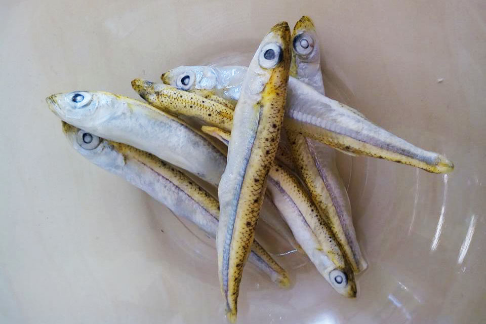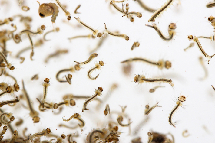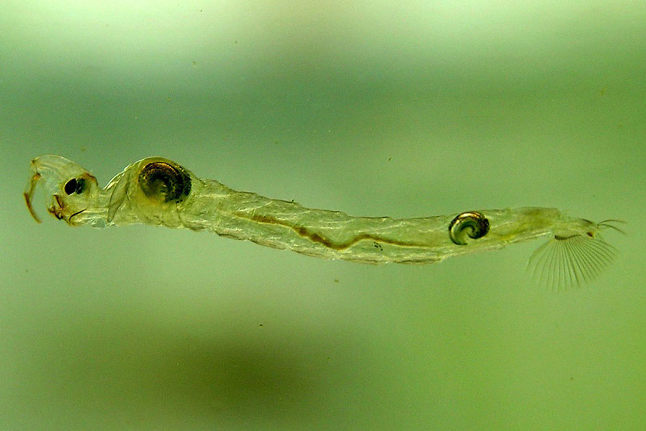 biele, sklovité larvy pakomárov rodu Corethra, veľké asi 2 cm